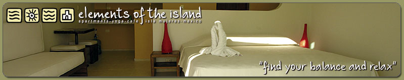 | elements of the island • apartments-cafe • Av. Benito Juárez 64 (between Lopez Mateos y Matamoros) • 77400 Isla Mujeres, Quintana Roo, México Phone: 0052 998 274 0098 from 8 am to 2 pm, Cellphone 0052 998 117 8651 • E-mail: info@elementsoftheisland.com |