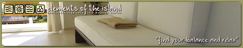 | elements of the island • apartments-cafe • Av. Benito Juárez 64 (between Lopez Mateos y Matamoros) • 77400 Isla Mujeres, Quintana Roo, México Phone: 0052 998 274 0098 from 8 am to 2 pm, Cellphone 0052 998 117 8651 • E-mail: info@elementsoftheisland.com |